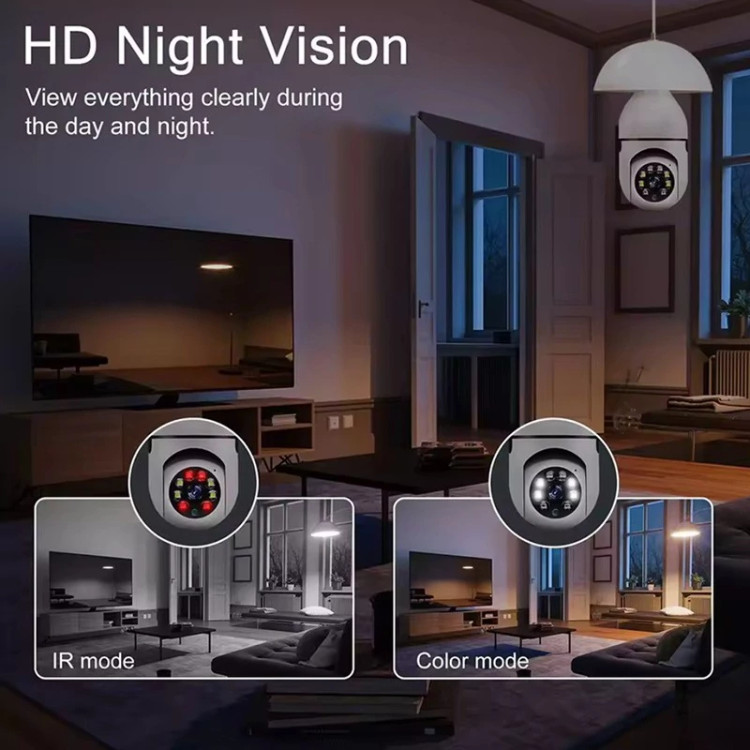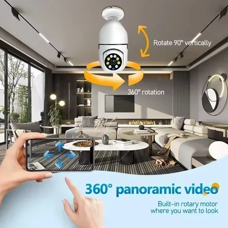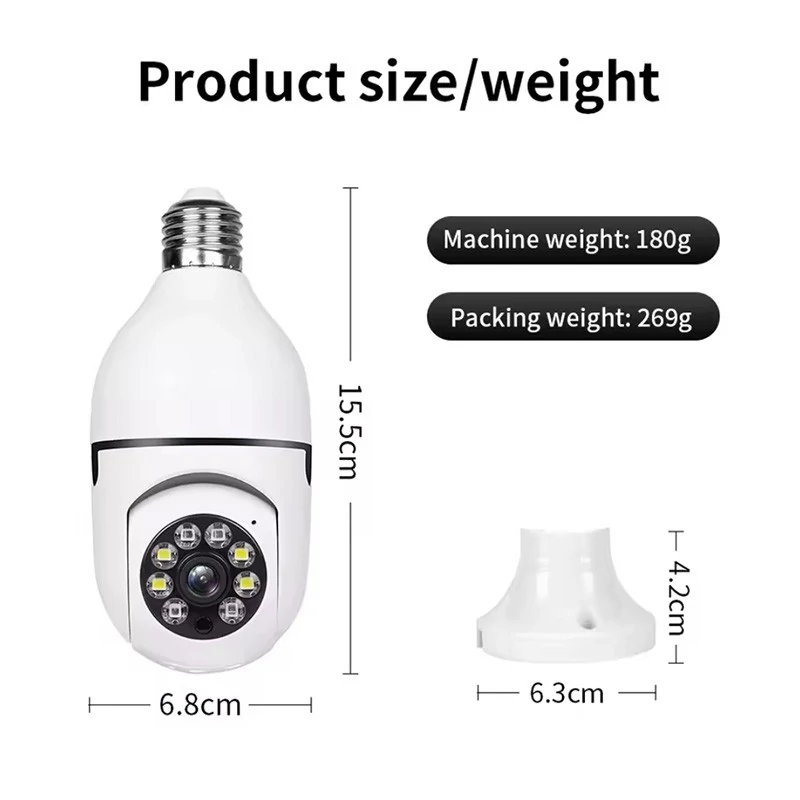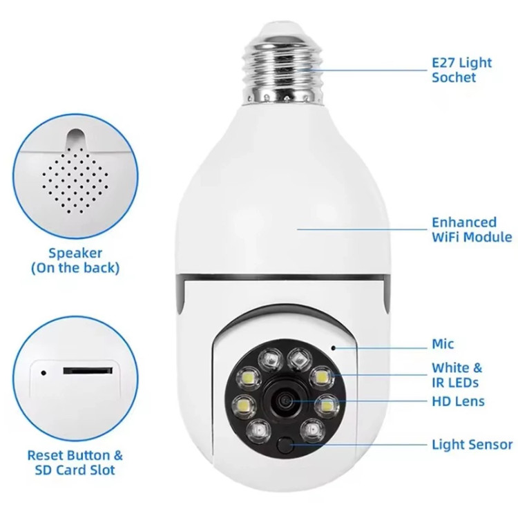 مناسب برای استفاده در مغازه، دفترکار، اتاق خواب و ... قابلیت چرخش 360 درجه ای از طریق ریموت برنامه تلفن همراه وضوح کیفیت HD به همراه محل قرارگیری حافظه جهت ضبط تصاویر امکان اتصال به اینترنت از طریق Wifi و کنترل از راه دور قابلیت ضبط و شنود آنلاین صدای محیط اطراف دوربین به همراه 4 نور LED و 4 نور دید در شب برنامه قابل نصب بر روی انواع تلفن های هوشمند اندرویدی و IOS امکان اعلان آلارم بر روی موبایل در صورت مشاهده حرکت در فضای دید دوربین به همراه سنسور تشخیص روشنایی و روشن شدن اتوماتیک نور دید در شب در مواقع کم نور امکان نصب راحت بر روی سرپیچ لامپ به همراه پایه سرپیچ، پیچ و رول پلاک